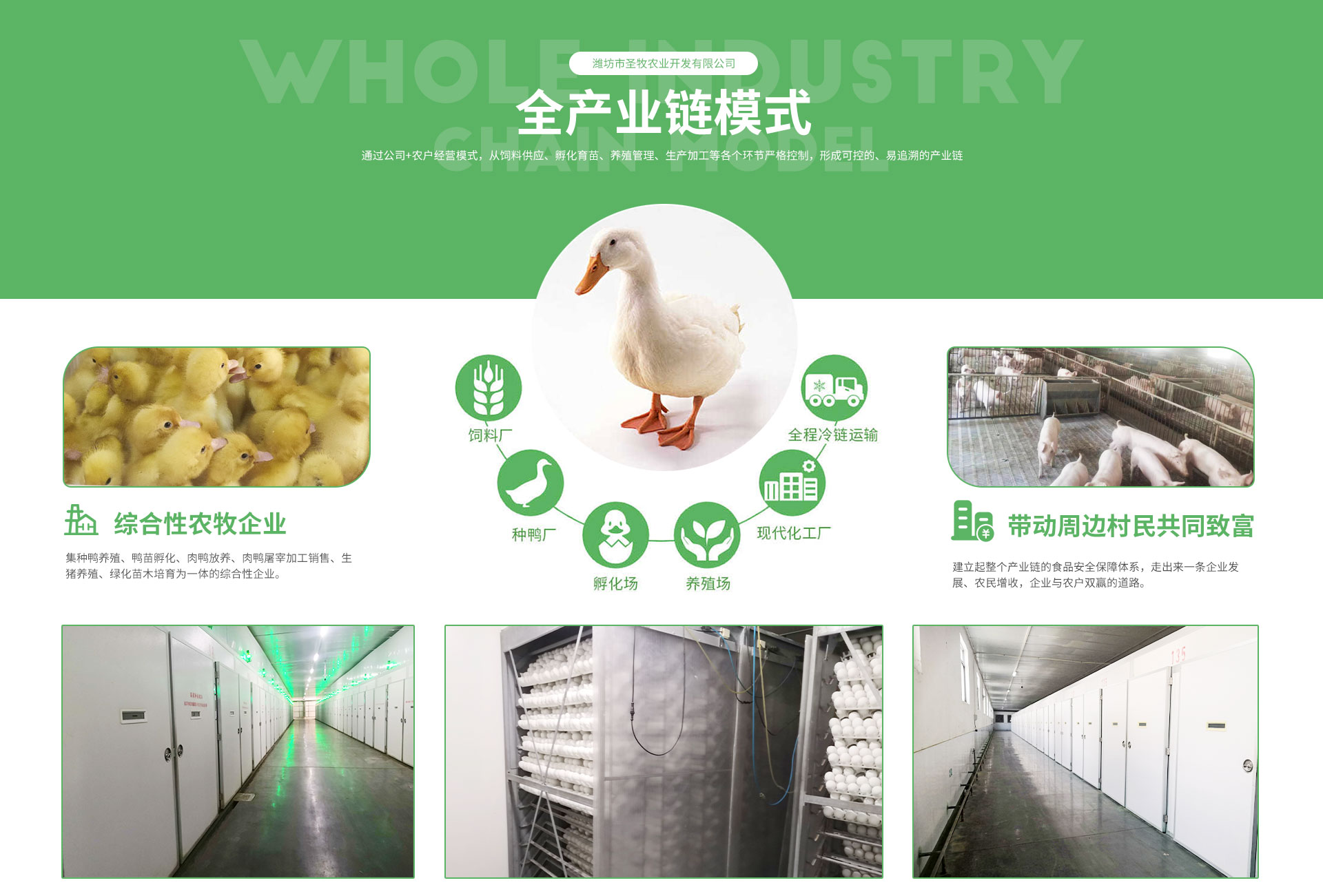 潍坊市圣牧农业发展有限公司是一家集种鸭养殖、鸭苗孵化、肉鸭放养、肉鸭屠宰加工销售、生猪养殖、绿化苗木培育为一体的综合性农牧业企业。潍坊市圣牧农业发展有限公司旗下拥有临朐县圣牧食品有限公司、砀山圣牧鸭业有限公司、临朐县德一畜禽养殖专 业合作社三家公司。